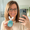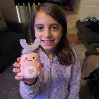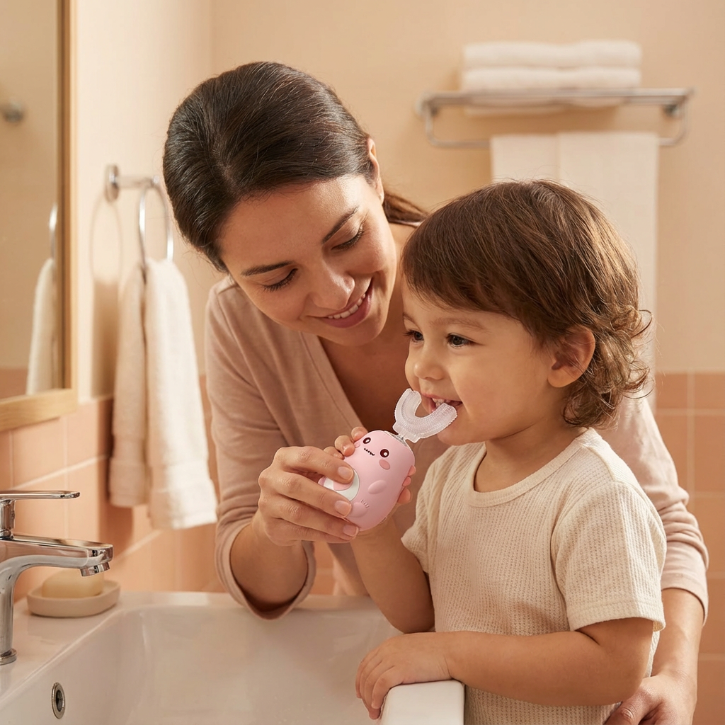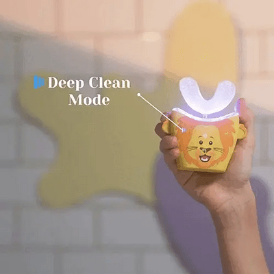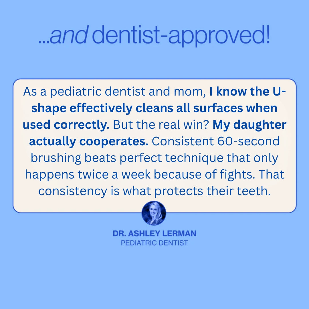 A U-shaped electric toothbrush designed for kids who hate brushing. The soft silicone mouthpiece wraps around all their teeth at once — front, back, and chewing surfaces — so they get a full clean in 60 seconds with gentle side-to-side motions.
